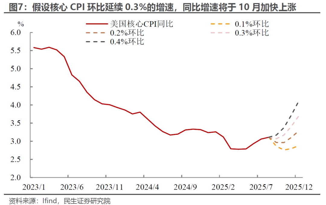 那么,如何判断后续通胀与降息节奏?我们认为,四季度核心通胀同比将面临上行拐点。即便假设核心CPI环比延续当前0.3%的温和增速,其同比增速也将于10月迈入上升通道,摆脱连续3个月的稳定状态(3.1%左右),10-12月核心CPI同比预计分别升至3.2%、3.4%和3.7%。